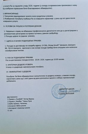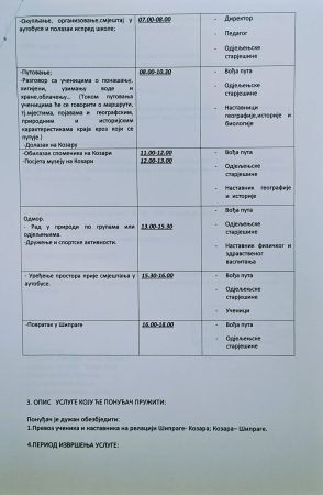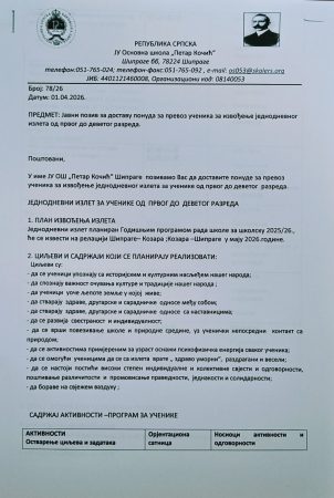 Јавни позив за превоз ученика за извођење једнодневног излета за ученике од I до IX разреда